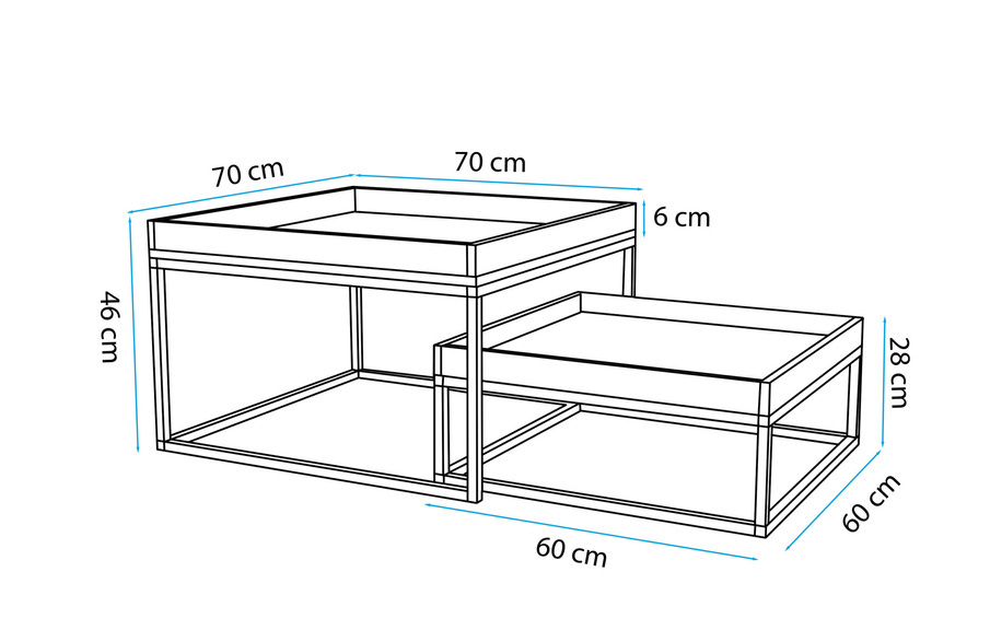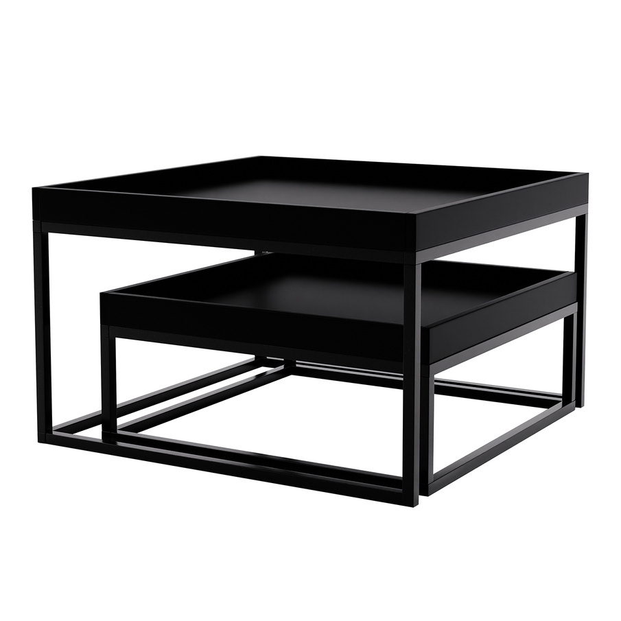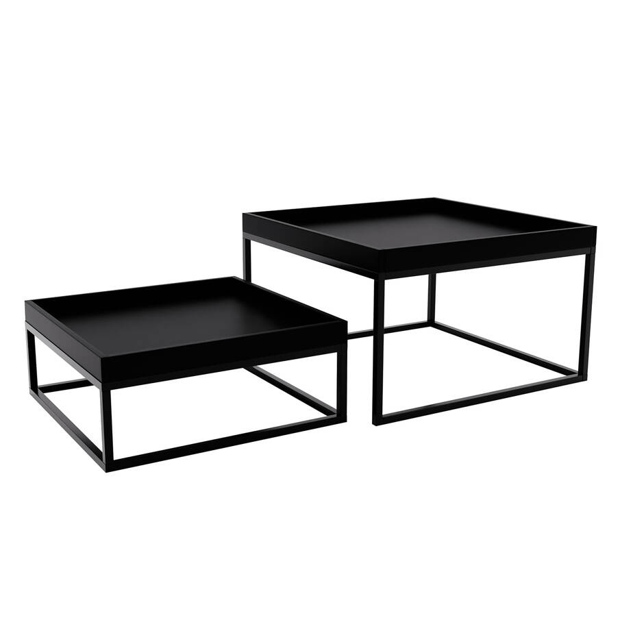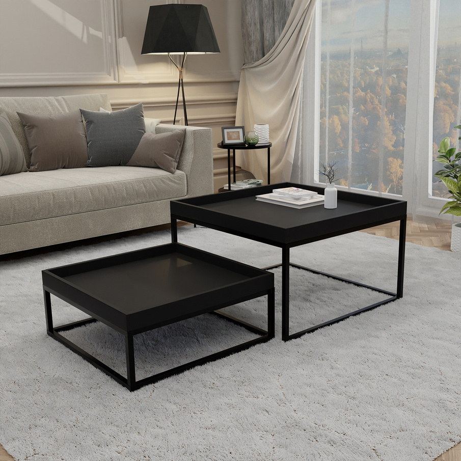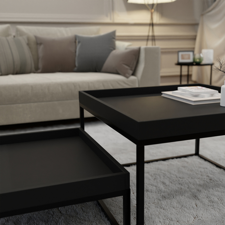 Det hele er holdt i en minimalistisk, men samtidig tidløs stil, der passer til mange indretningsarrangementer. Den sorte bordplade tilføjer lethed og lysstyrke til rummet, og harmonerer perfekt med de forskellige farver i indretningen. Det står i kontrast til en solid, sort metalramme, som ikke kun giver møblet karakter, men også sikrer stabilitet og holdbarhed. Begge borde har en sænket plade, som giver møblerne et distinkt og unikt udtryk, men også beskytter din dekoration mod utilsigtede fald og beskytter rummet omkring det, hvis vi skulle spilde noget.