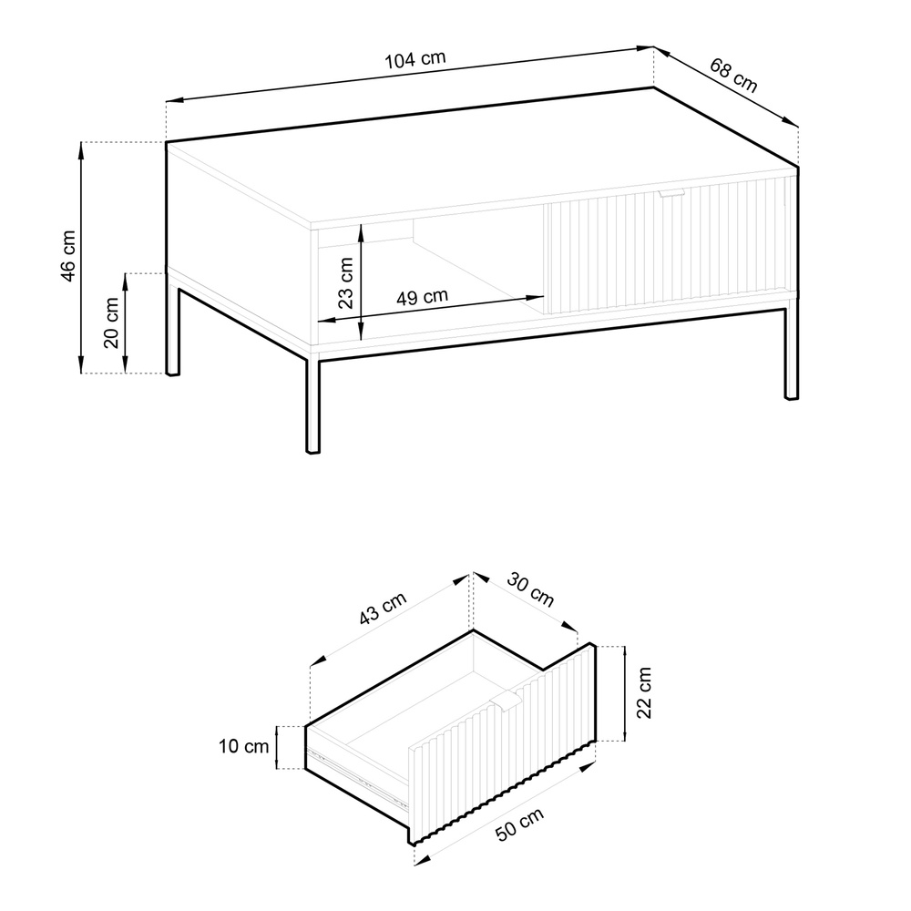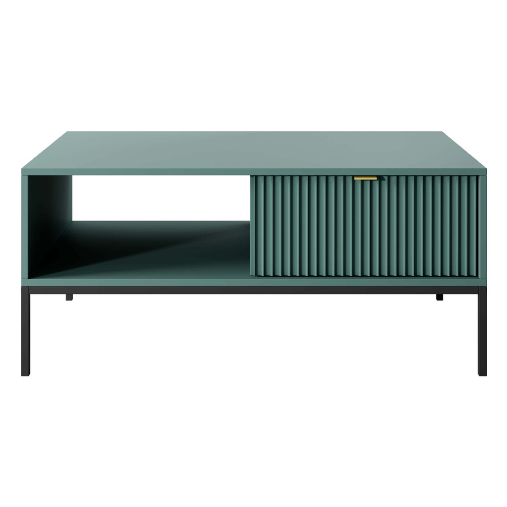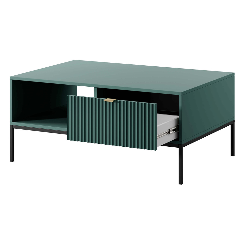 VOLARE sofabord med skuffe vil perfekt komplementere din stue. Det vil ændre sig fra et kedeligt rum til et funktionelt og smukt præsenteret rum til afslapning. Dette møbel har en rummelig, glat, rektangulær top, hvorpå du nemt kan stille fx en vase fuld af blomster og en kop kaffe til en veninde, når hun kommer på besøg. Sofabordet er udstyret med et praktisk åbent rum og en rummelig skuffe. Du kan finde plads til den bog, du læser, tabletten eller fjernbetjeningen til TV'et her. Dit rum vil se pænt ud, og alt dette er lige ved hånden! Bordet suppleres af slanke, høje ben, der matcher kroppens farve flot. Denne løsning gør hele looket ekstremt elegant. VOLARE-kollektionen er helt anderledes end de tidligere, du måske har set på vores hjemmeside. Den er designet til at passe til nutidens trends - høje, sorte ben, geometrisk form og flaske grøn farve understreger elegance og moderne stil, men henviser også stærkt til loftsstemningen. Det minimalistiske gyldne håndtag giver møblet ekstra værdi og øger indretningens prestige. Dette er modulopbyggede møbler, så de kan kombineres frit. Der er ikke noget simpelt mønster til disse møbler - de passer overalt, hvor du ser dem.