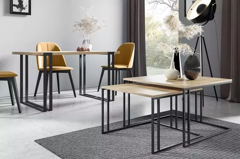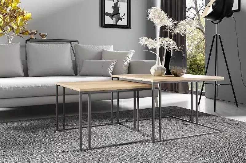 Et moderigtigt og praktisk sofabord i stuen? Med Astro sofabordssættet er det muligt! Et opholdsområde i stuen er et sted, hvor vi bruger overraskende lang tid. Og det er at slappe af i ensomhed, møde gæster over en kop kaffe og se tv med familien. Så lad os sørge for, at hoveddelen, altså sofabordet, ser smukt nok ud, 2in1 sofabord er den perfekte løsning for folk, der kan lide at kombinere klassisk elegance med design. Bordpladerne er stiliseret som ægte træ. Deres minimalisme er original, og den ændrer husets indretning på en original måde og giver det en tidløs stil. Takket være de anvendte materialer af høj kvalitet er disse borde modstandsdygtige over for ridser, stød og høje temperaturer. Strukturen er monteret på en slidstærk pulverlakeret metalramme, som ikke kun sikrer dens høje stabilitet, men også betager med sin originale, geometriske form.