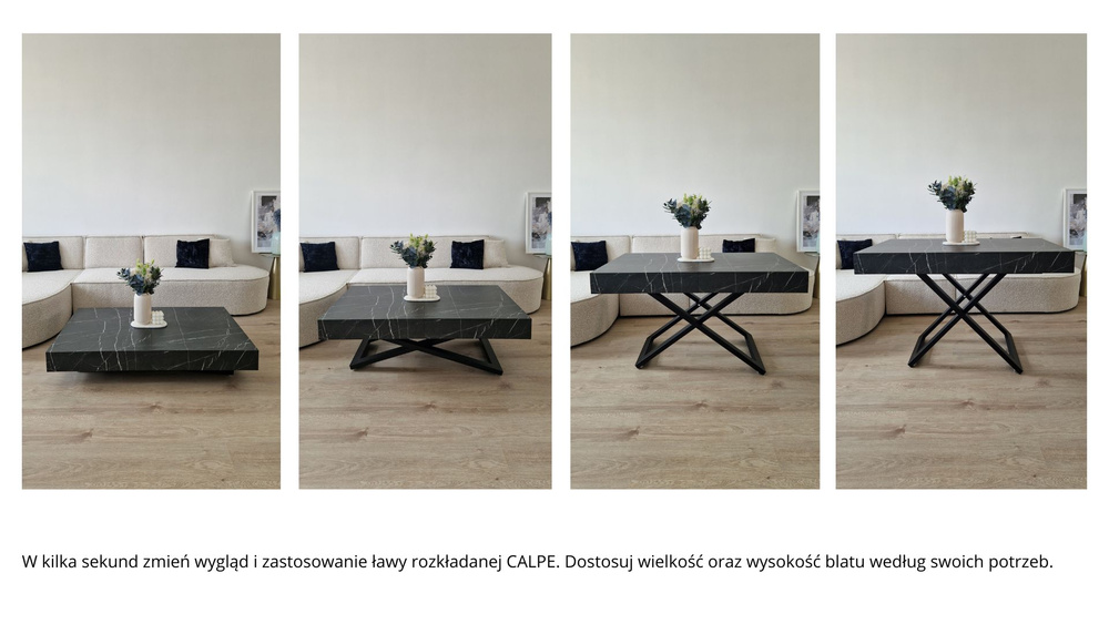 Innovativt, funktionelt, rektangulært bord CALPE, er ikke kun et møbel til daglig brug, men også et udtryk for funktionalitet og stil i ethvert rum. Den unikke konstruktion gør det muligt at tilpasse sig fleksibelt til skiftende pladsbehov og antallet af personer, der bruger overfladen.