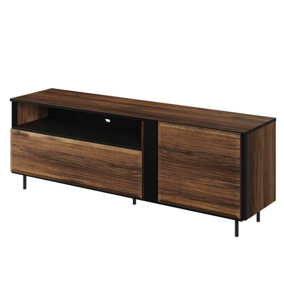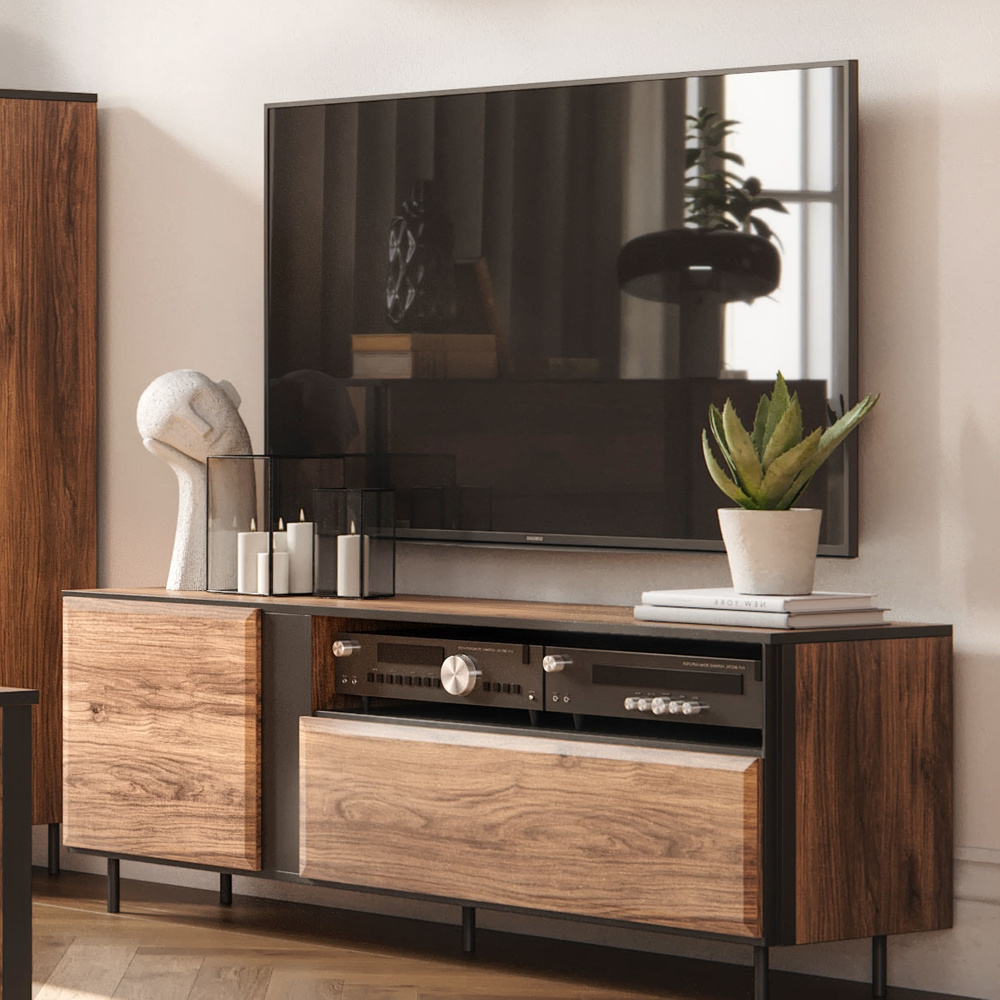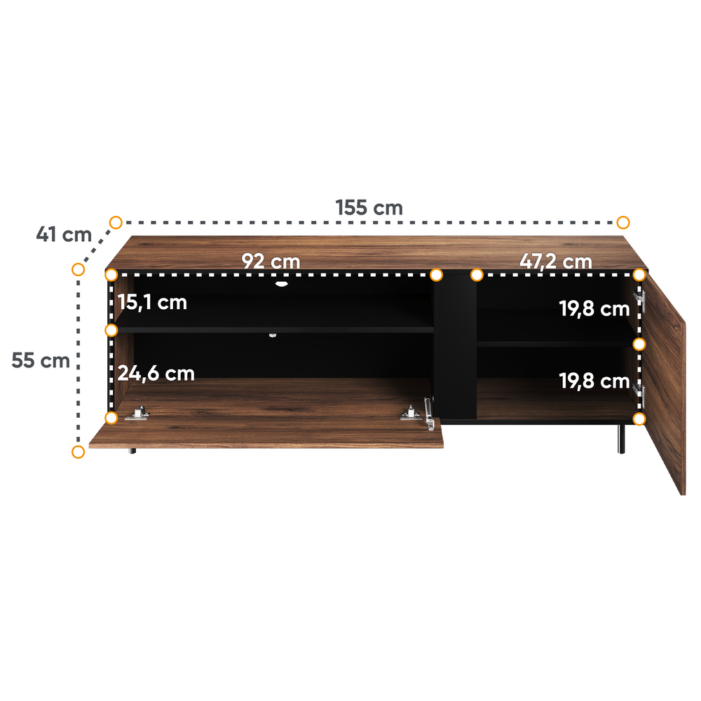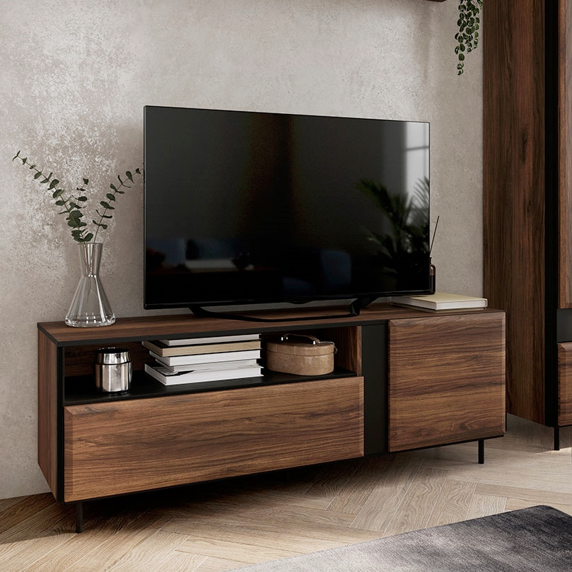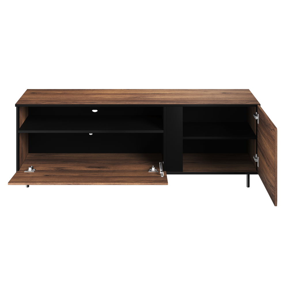 Elegant og funktionel BORGA TV-skab i moderne stil. Møblerne står på lette, meget slanke ben. Kombinationen af sort og mørkt træ ser moderigtigt, stilfuldt ud og giver samtidig interiøret en masse hyggelig varme. De karakteristiske, delte fronter med interessante fræsede kanter understreger møblernes unikke stil. Loftet til åbning og / eller blød lukning af systemet sikrer behagelig lukning og åbning.