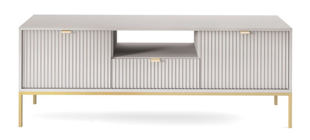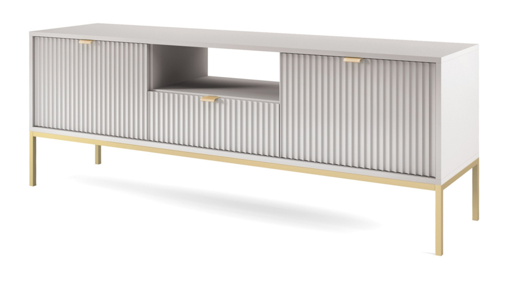 Møbler til TV i en moderne udgave? Dette er tv-bænken VOLARE. Volare-kollektionen er et moderne design, der helt sikkert vil tiltrække alle gæsters opmærksomhed. Kroppen er lavet af et solidt møbelbræt, som sikrer strukturens holdbarhed, og de høje, slanke ben er dens stabile støtte. Den præsenterede model er udstyret med et par aflåselige skabe og en skuffe. Her kan du nemt opbevare forskellige småting: æsker med spil og film, tilbehør i form af ekstra kabler. De enheder, der er tændt oftest, kan placeres i en praktisk fordybning eller placeres på en bred bordplade. Mangel på en bagvæg i fordybningen sikrer tilstrækkelig luftcirkulation, takket være hvilken elektronikken ikke vil overophedes under intensivt arbejde. Volare har en geometrisk stålramme og rillede fronter. Fine gyldne greb er praktiske og komfortable.