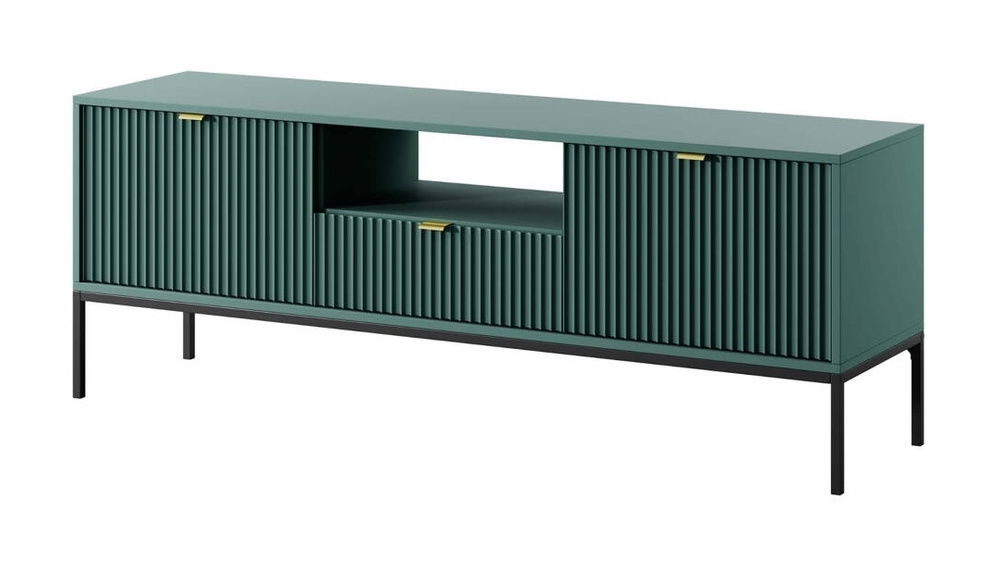 Volare tv-bænk er et moderne design, der helt sikkert vil tiltrække alle gæsters opmærksomhed. Kroppen er lavet af solid møbelplade, som sikrer strukturens holdbarhed, og de høje, slanke ben giver den stabil støtte. Den præsenterede model er udstyret med et par aflåselige skabe og en udtræksskuffe. Her kan du nemt opbevare forskellige småting: Brætspil, en filmsamling eller lille elektronik. Volare har en geometrisk stålramme og rillede fronter. Fine gyldne håndtag er praktiske og komfortable. Tv-bænken imponerer med sin smukke, dybe nuance af flaskegrøn. VOLARE-kollektionen er helt anderledes end de tidligere, du måske har set på vores hjemmeside. Den er designet til at passe til nutidens trends - høje, sorte ben, geometrisk form og farve understreger elegance og moderne stil, men henviser også stærkt til loftsstemningen. Minimalistiske guldfarvede greb giver møblet merværdi og øger indretningens prestige. Dette er modulopbyggede møbler, så de kan kombineres frit. Der er ikke noget simpelt mønster til disse møbler - de passer overalt, hvor du ser dem.