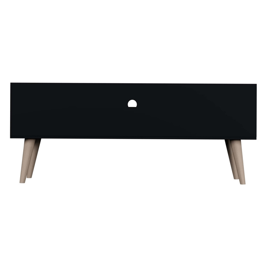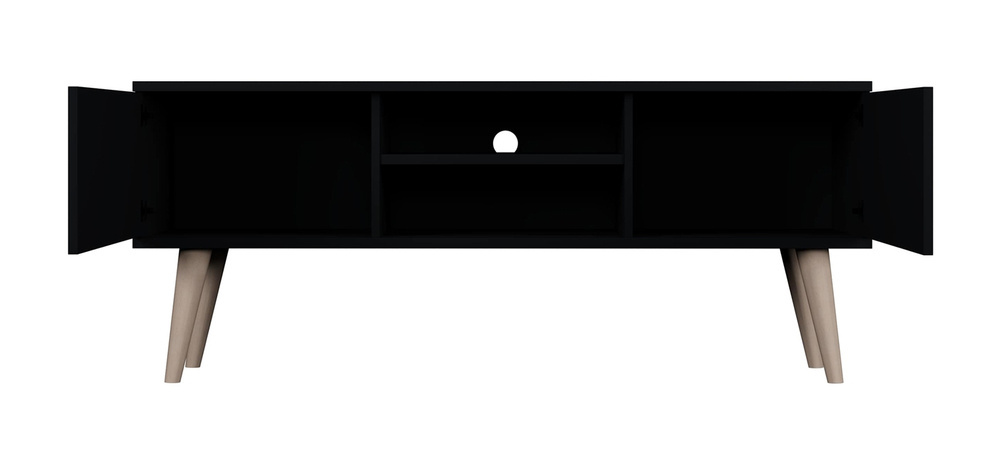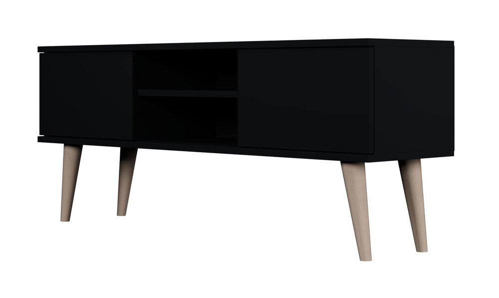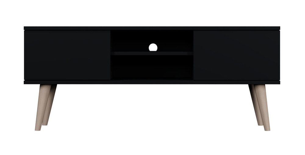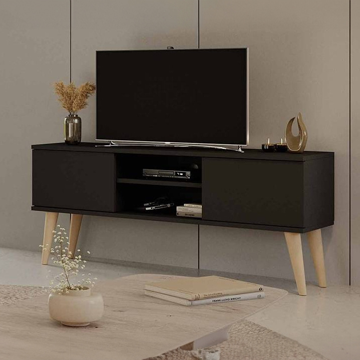 Sort tv-bænk til stuen TORONTO til stuen er et praktisk møbel til tv'et, vedligeholdt i moderne skandinavisk design. Tv-bænken er ideel til små eller mellemstore stuer og saloner. Den er udstyret med to døre og et åbent rum med en hylde, takket være hvilken der vil være plads til en dekoder, konsoller eller andet udstyr. Møblet har et hul bagpå, hvorigennem du nemt kan føre kablerne til lyd- og videoudstyr. Skabet står på ben med en højde på 25 cm, hvilket gør det nemmere at holde rent under møblerne. Det skandinaviske tv-bord er vedligeholdt i en afdæmpet, moderne stil og er lavet af højkvalitets lamineret plade, som yderligere er sikret med en ABS-kant. Det gør møblerne modstandsdygtige over for mekaniske skader og fugt, og købet vil være en investering i mange år. TORONTO skabe fås i flere farvevarianter at vælge imellem.